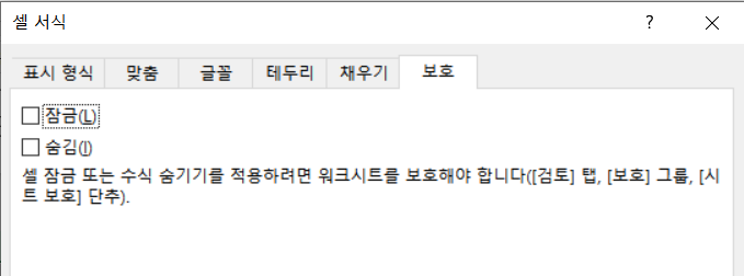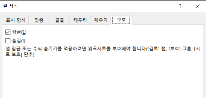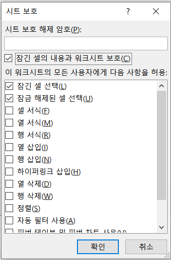 잠긴 셀의 내용과 워크시트 보호 체크박스 체크하고