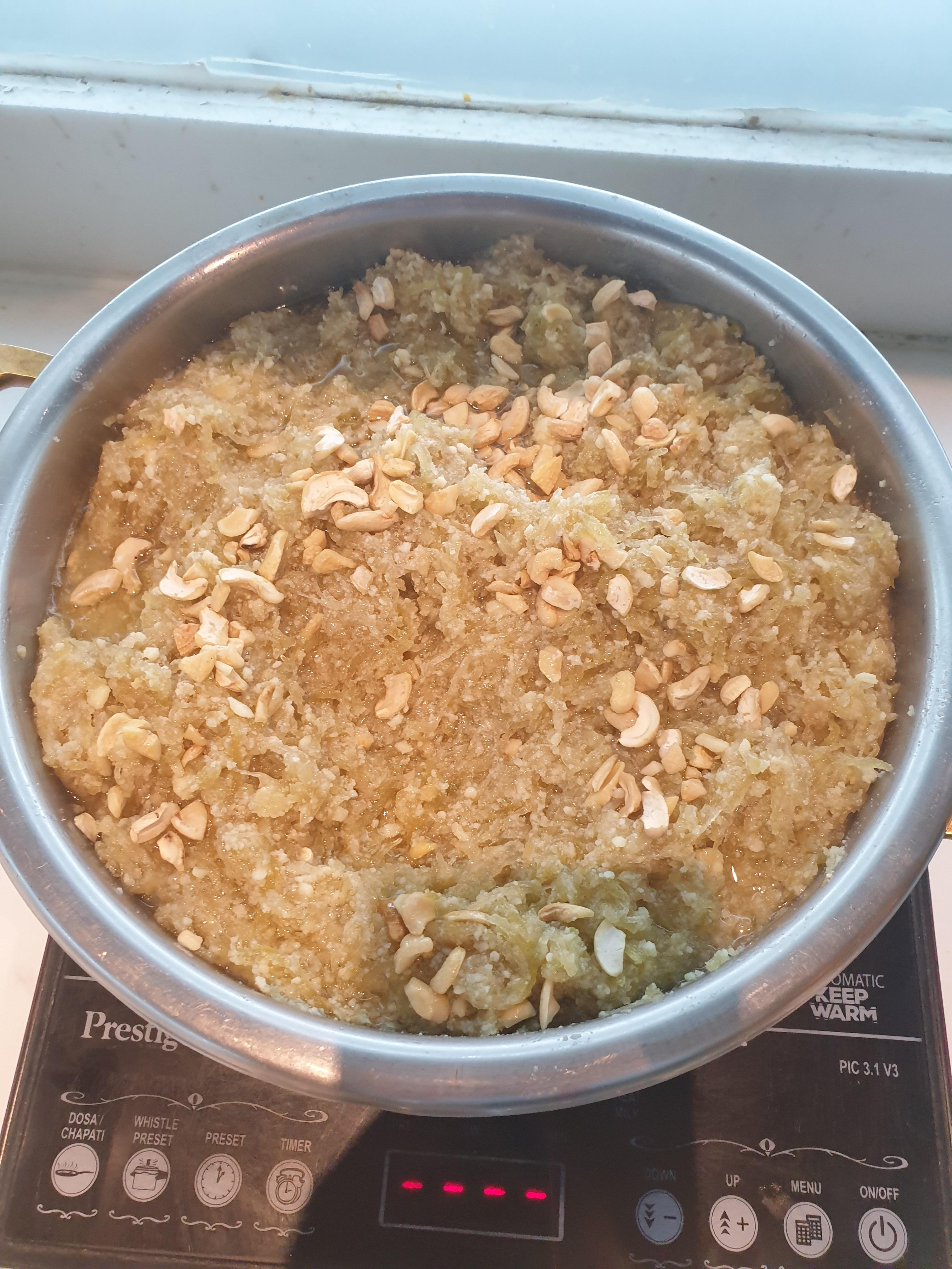 Lauki halwa is a sweet Indian dessert made with bottle gourd or opo squash, milk, ghee, sugar and flavored with cardamom and nuts.