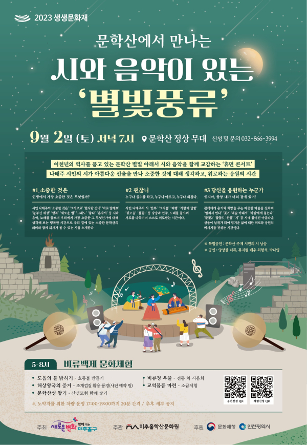 인천 미추홀학산문화원은 9월 2일 문학산 정상 야외무대에서 ‘별빛풍류’ 음악회를 진행한다고 29일 밝혔다.별빛풍류는 인천의 고대 왕국 미추홀의 진산이며, 미추홀구의 대표적 문화재인 문