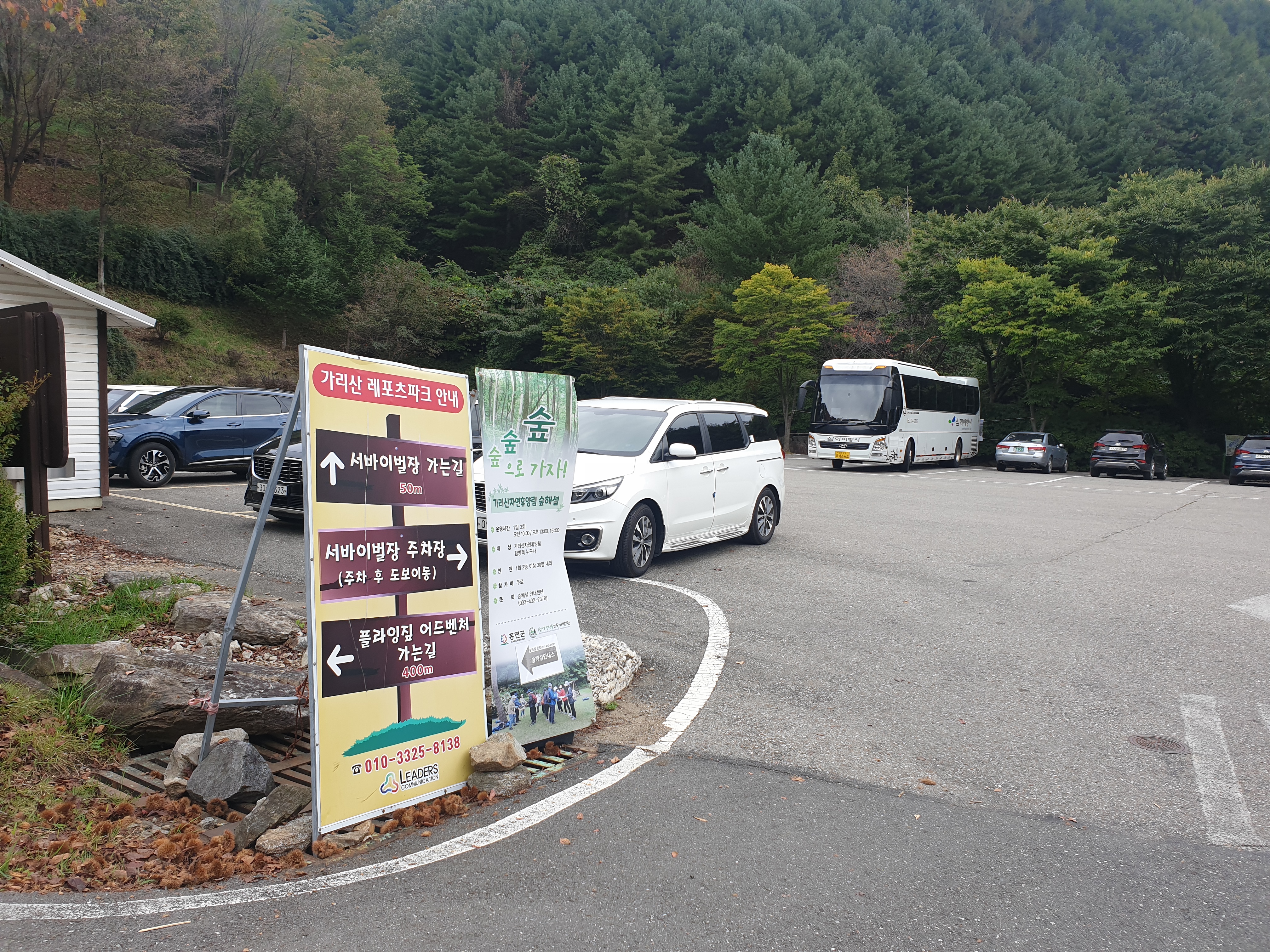 자연휴양림에 들어서면 바로 서바이벌 주차장이 있다.