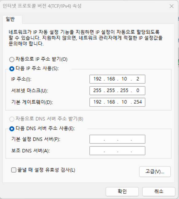 무선랜이 관리자페이지에 접속가능한 IP를 할당받지 못하는 경우가 있기 때문에 수동으로 IP를 먼저 설정해야 한다.