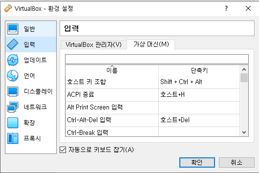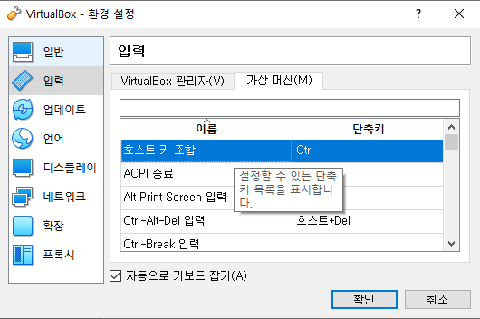 입력 > 가상머신 탭에서 호스트 키 조합 단축키를 변경할 수 있다.