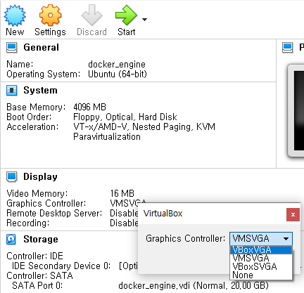 2. Settings > Display > Graphi s Controller를 VMSVGA -> VBoxVGA로 변경