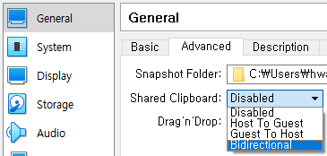 - General > Advanced에서 Shared Clipboard를 Disabled -> Bidrectional 로 변경