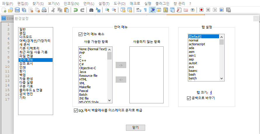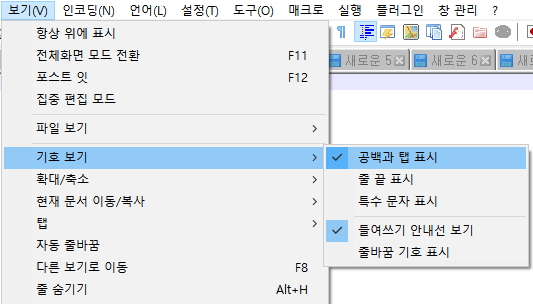 설정 > 환경설정 > 언어메뉴 > 탭설정 > 공백으로 바꾸기 체크