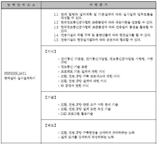 능력단위는 수행준거, 지식, 기술, 태도 항목을 기술하고 능력단위요소로 세분화 된다.